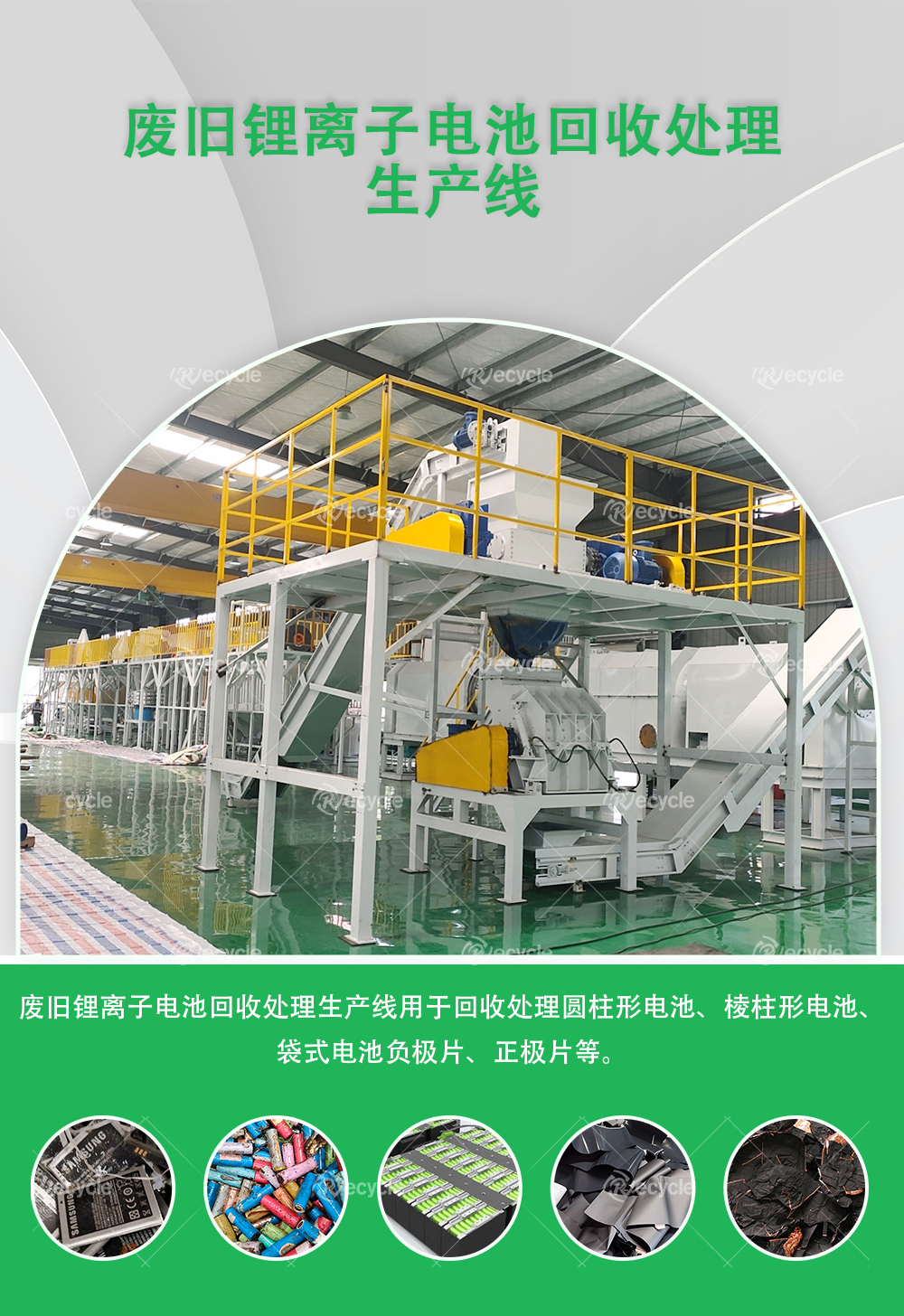 查看詳情鋰電池撕碎機(jī)用于回收利用廢舊鋰離子電池的前處理,該設(shè)備產(chǎn)業(yè)線(xiàn)主要包括三大系統(tǒng):破碎系統(tǒng)、熱解系統(tǒng)、分選系統(tǒng)。鋰電池撕碎機(jī)采用三級(jí)分選工藝,可撕碎單體電池,新能源鋰電池,動(dòng)力鋰離子電池,鋰電池正極材料,鋰電池負(fù)極材料,鋰電池卷芯料,邊角料等、銅鋁箔。撕碎可有效解決傳統(tǒng)工藝中銅、鋁箔不能被有效利用的問(wèn)題,撕碎后可分離出電極材料、銅箔、鋁箔純度高:銅、鋁回收率達(dá)到98%...